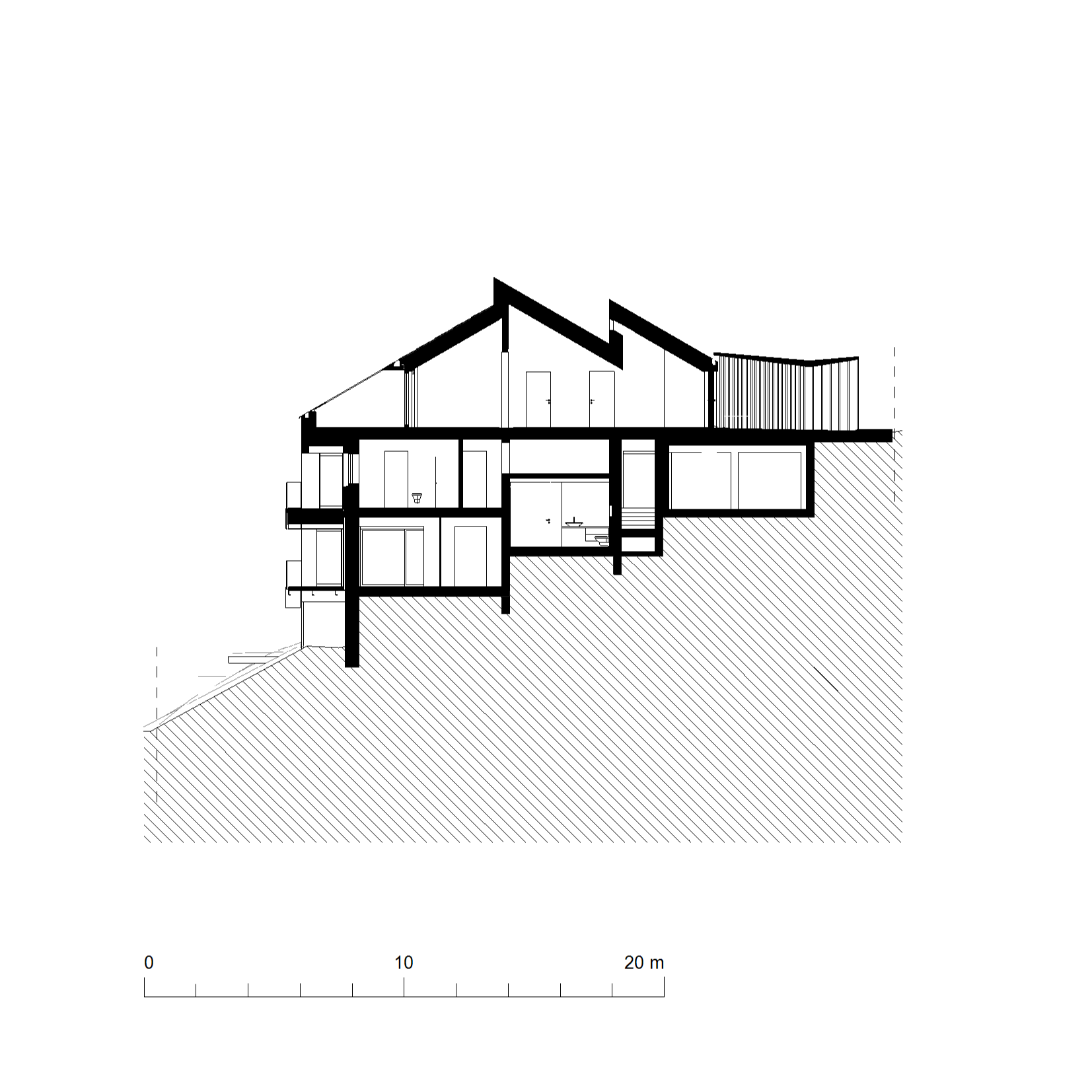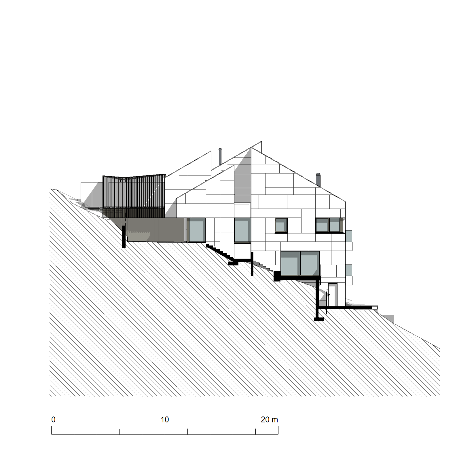 Das Gebäude staffelt sich in mehreren Ebenen am steilen Süd-Westhang.