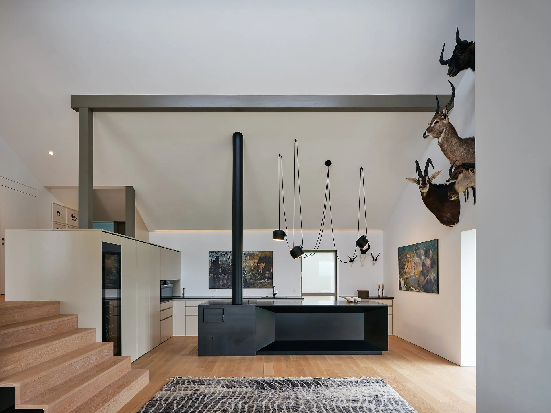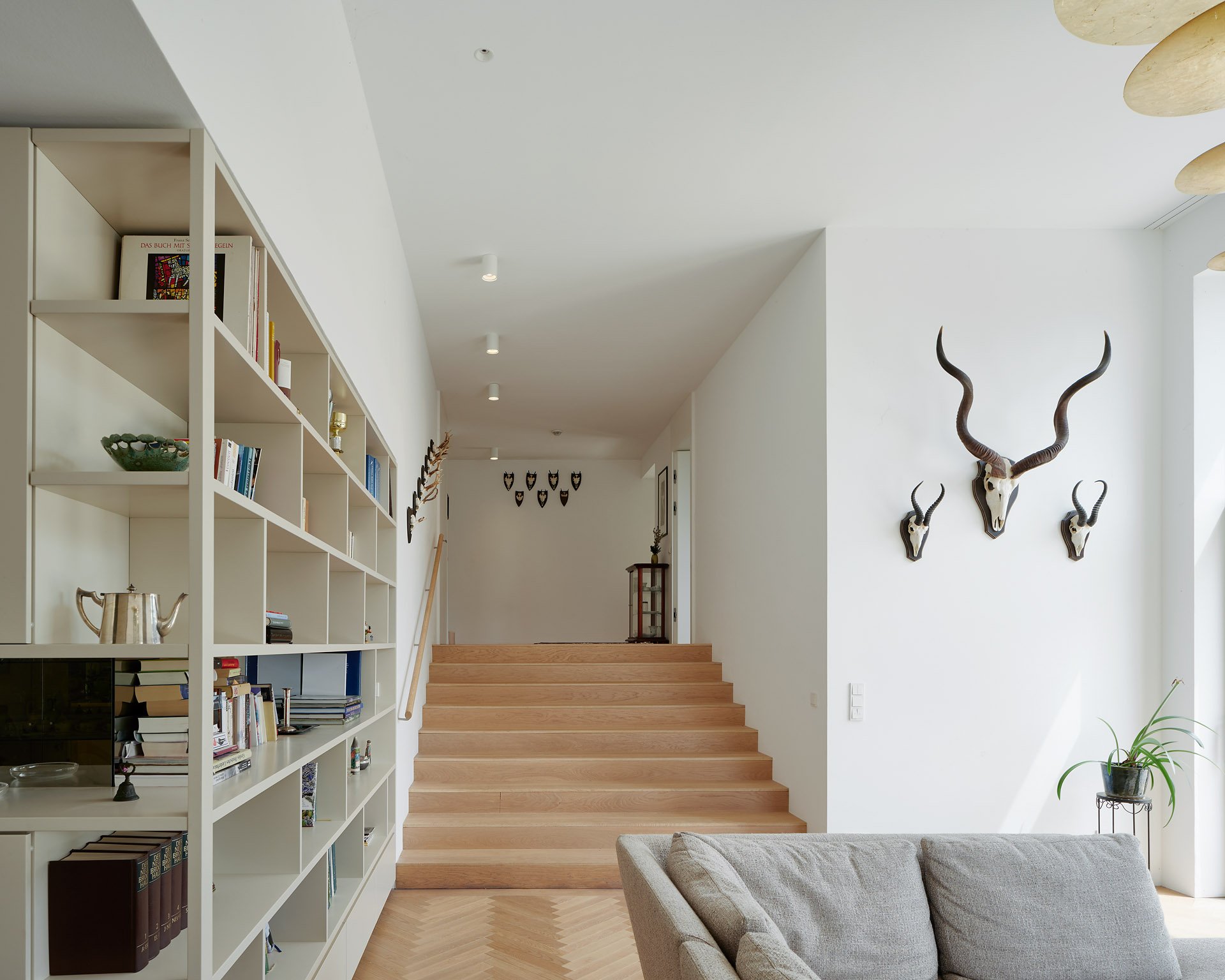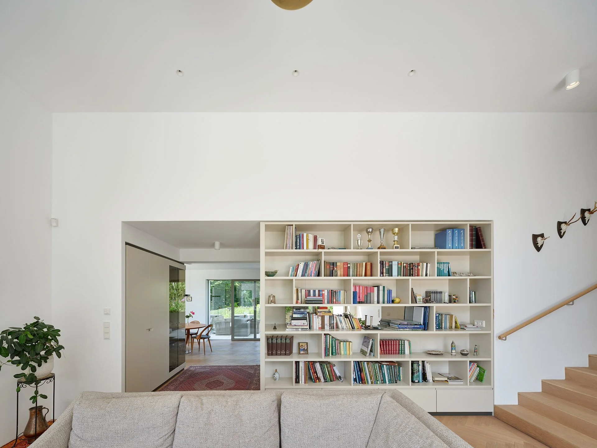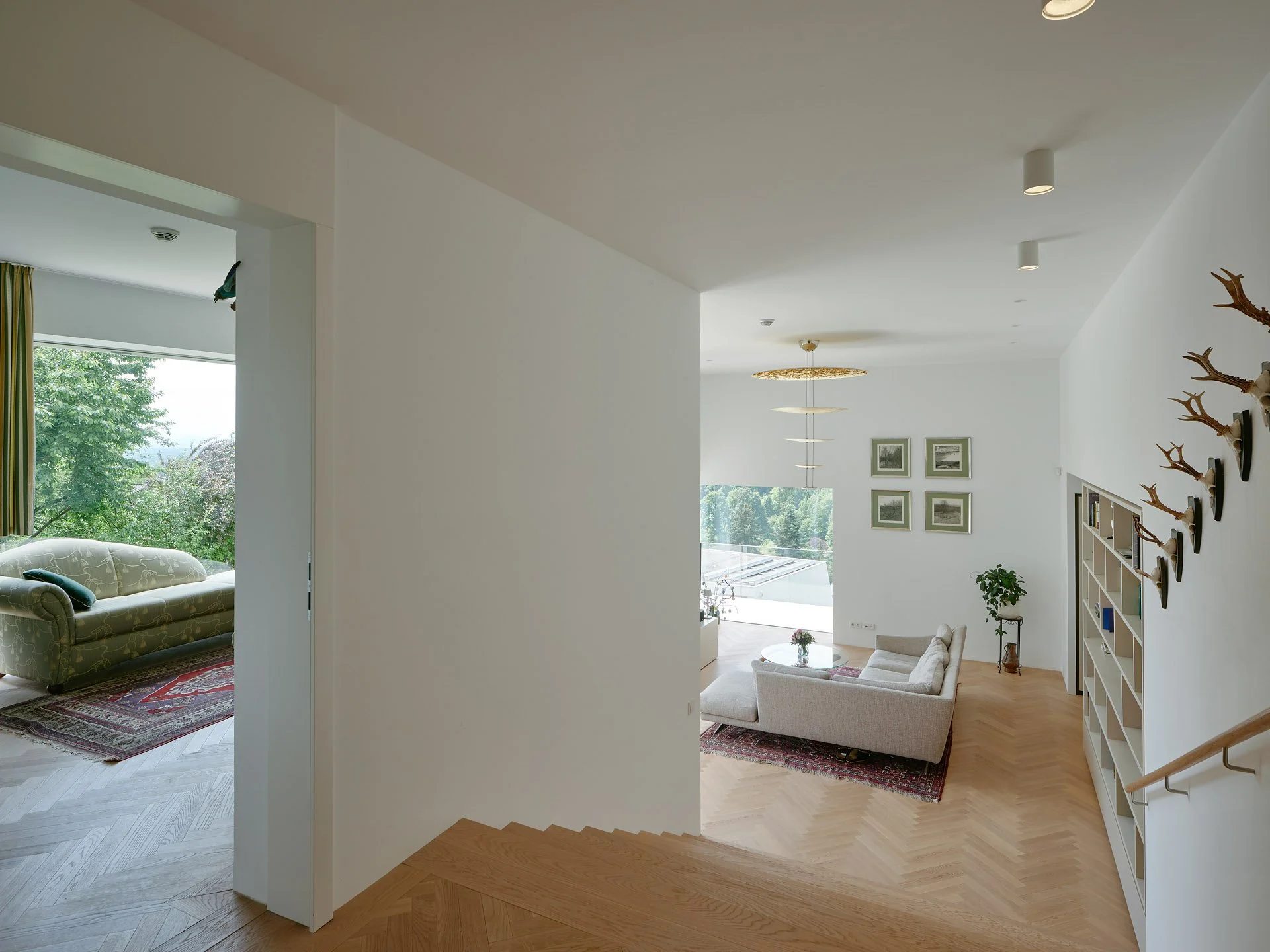 Bestehende Qualitäten wie Durchblicke und hohe Raumhöhen wurden erhalten oder verstärkt. Insgesamt wirkt die innere Raumanordnung nach dem Eingriff einfacher und logischer.