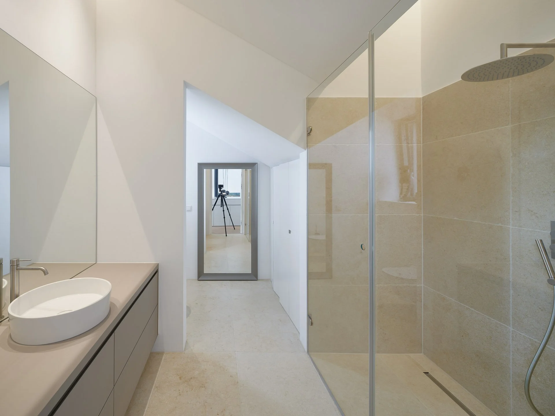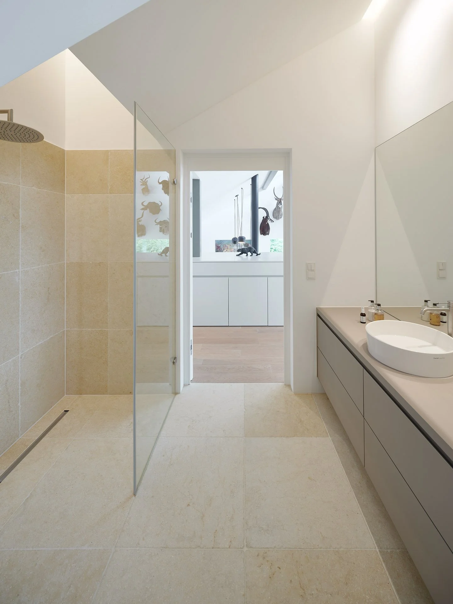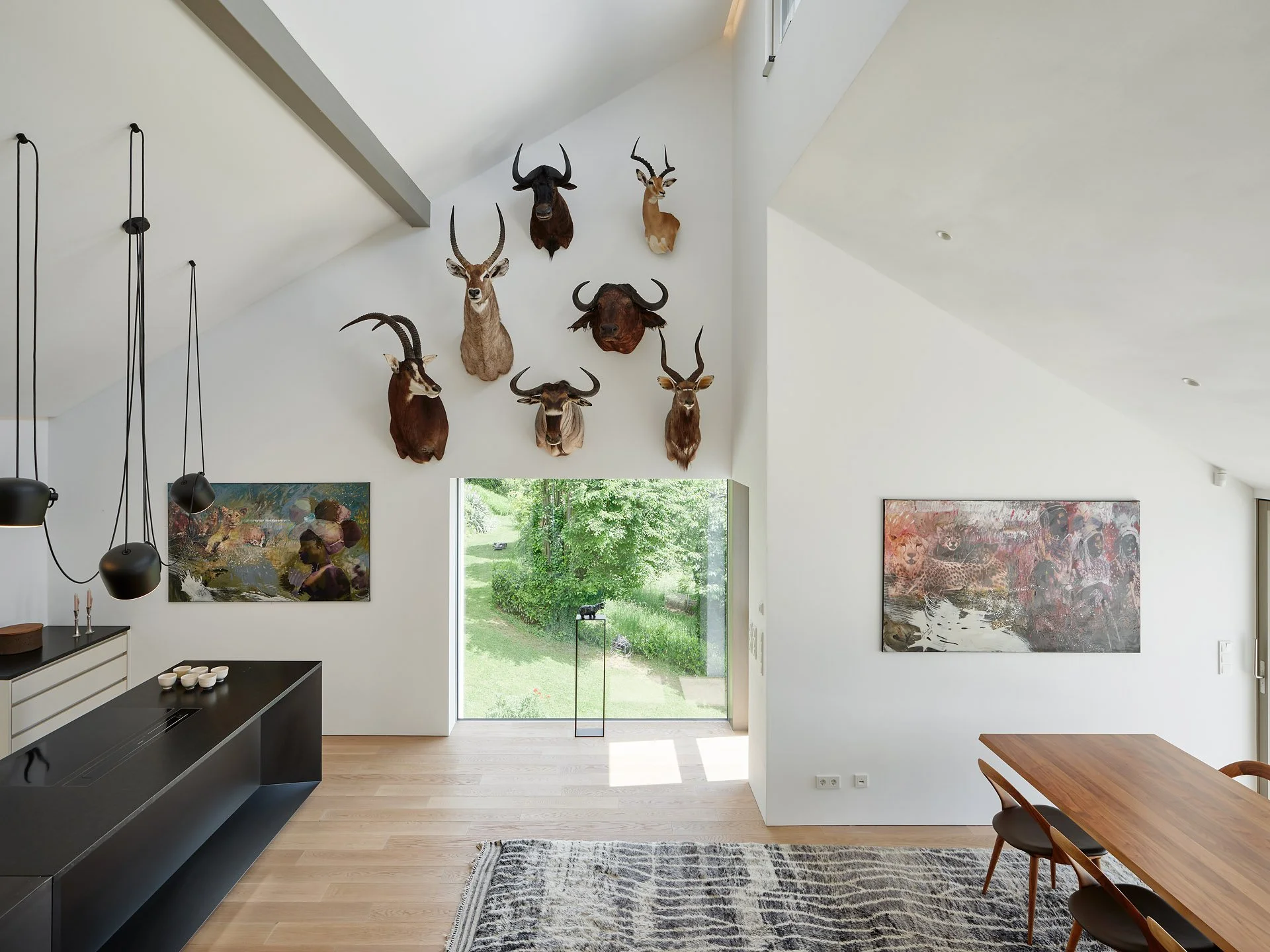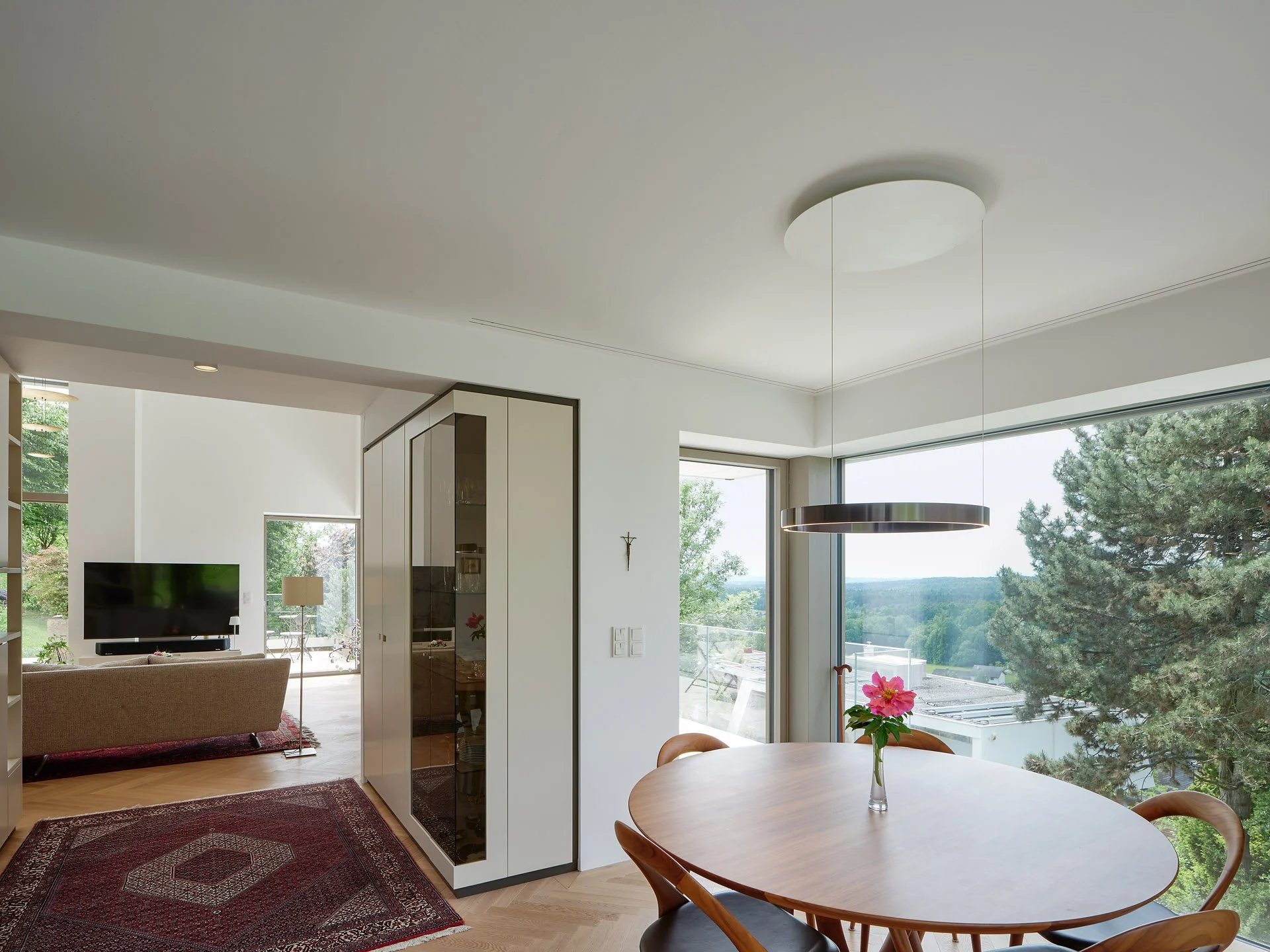 Bestehende Qualitäten wie Durchblicke und hohe Raumhöhen wurden erhalten oder verstärkt. Insgesamt wirkt die innere Raumanordnung nach dem Eingriff einfacher und logischer.