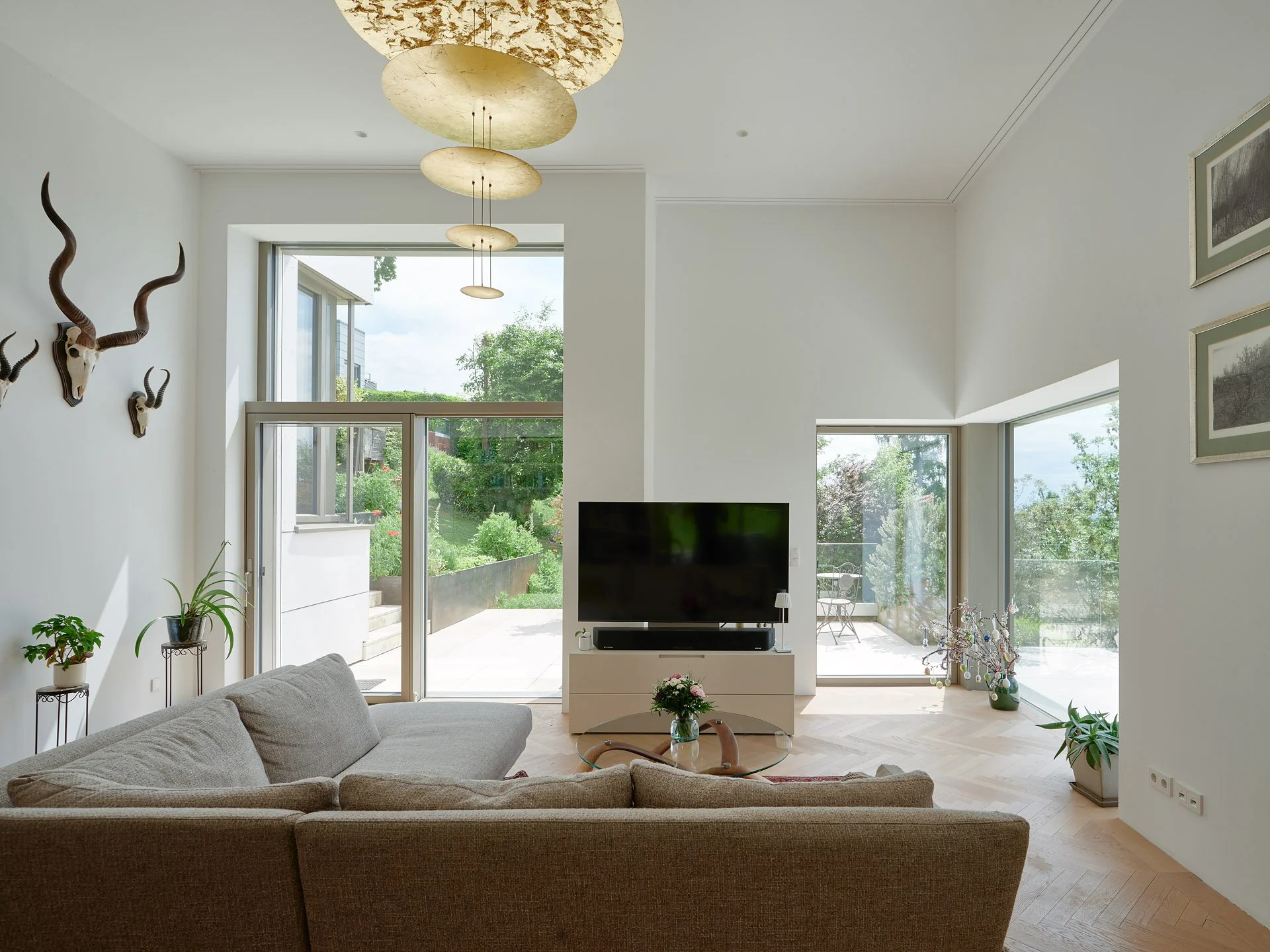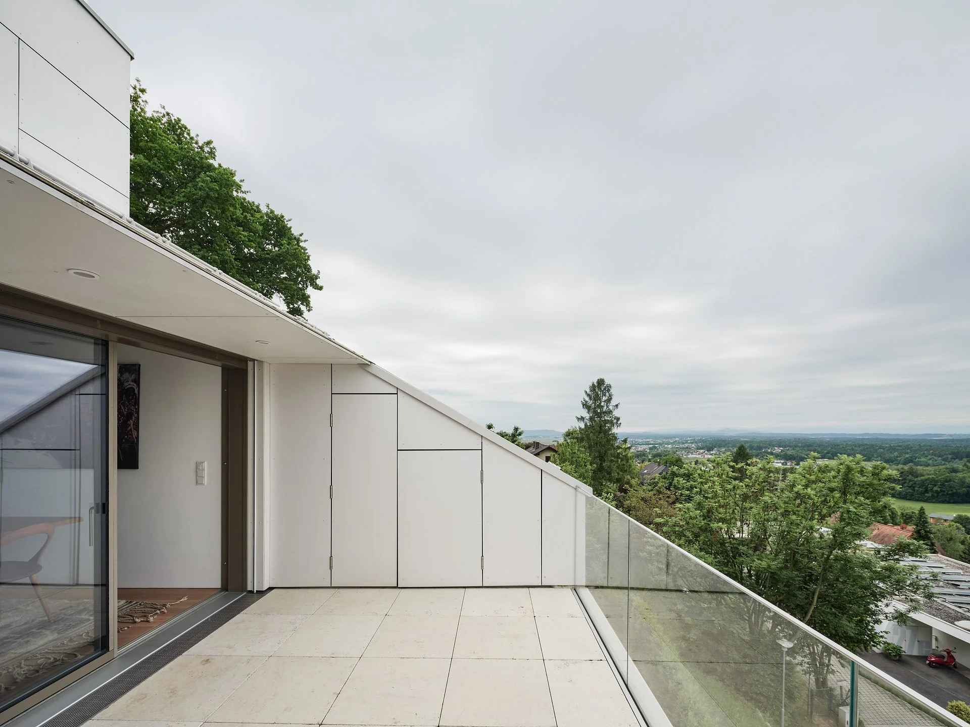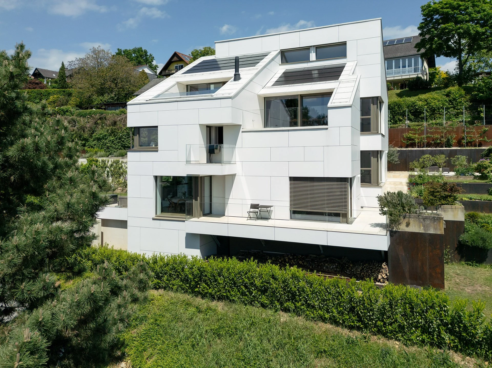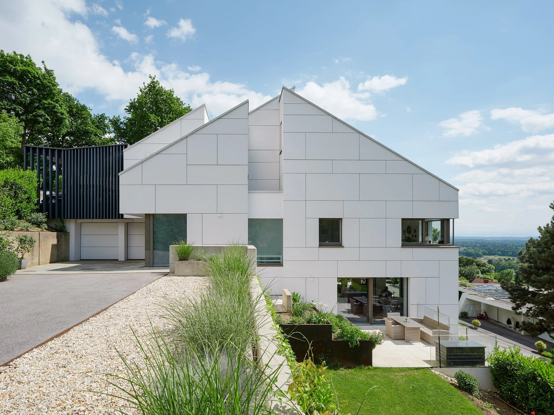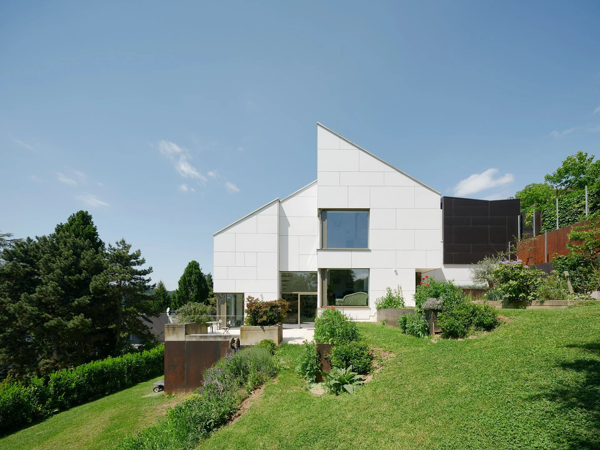 Das System aus Terrassen fügt sich in den Hang ein und bietet unterschiedliche Außenräume.