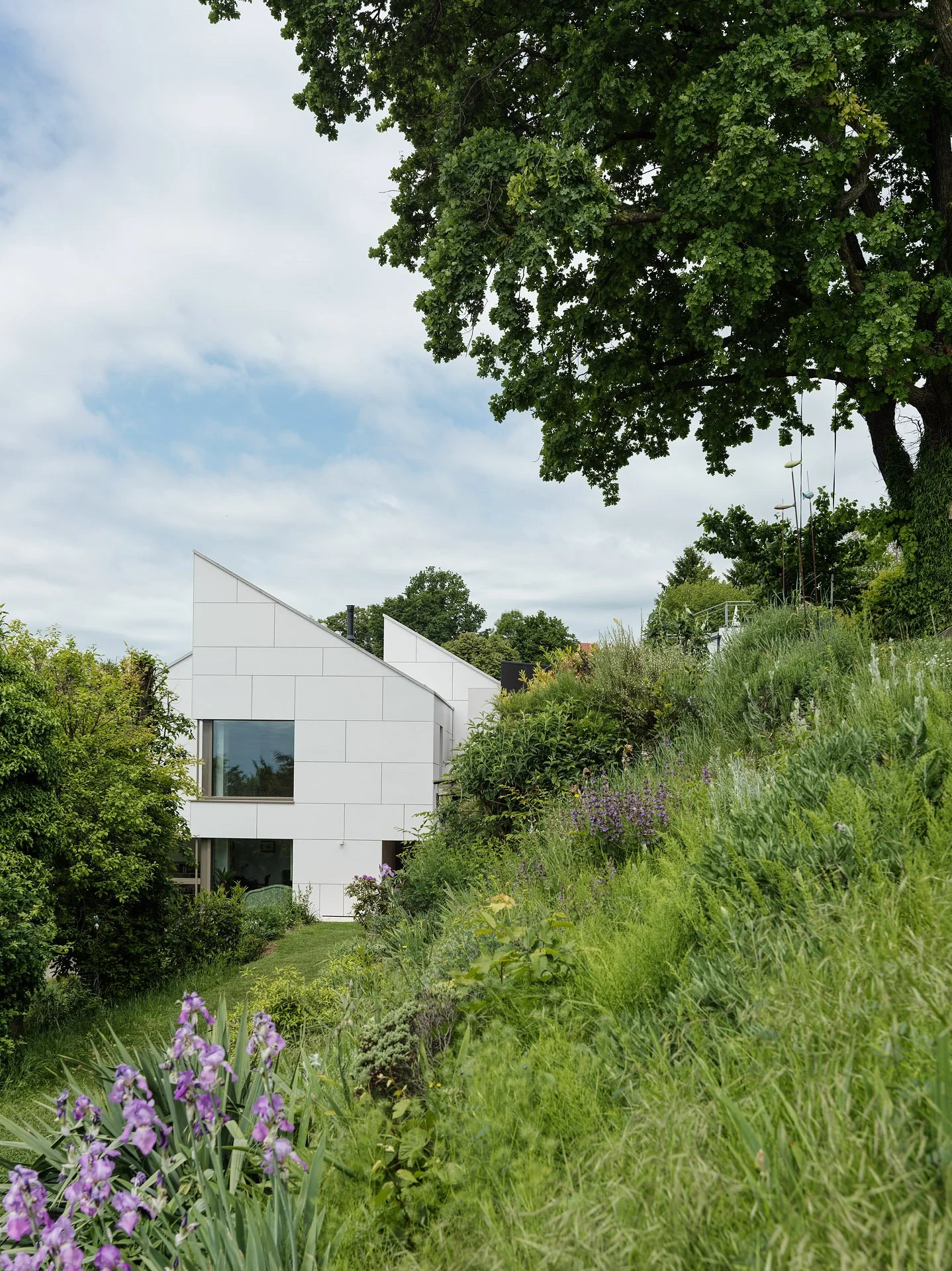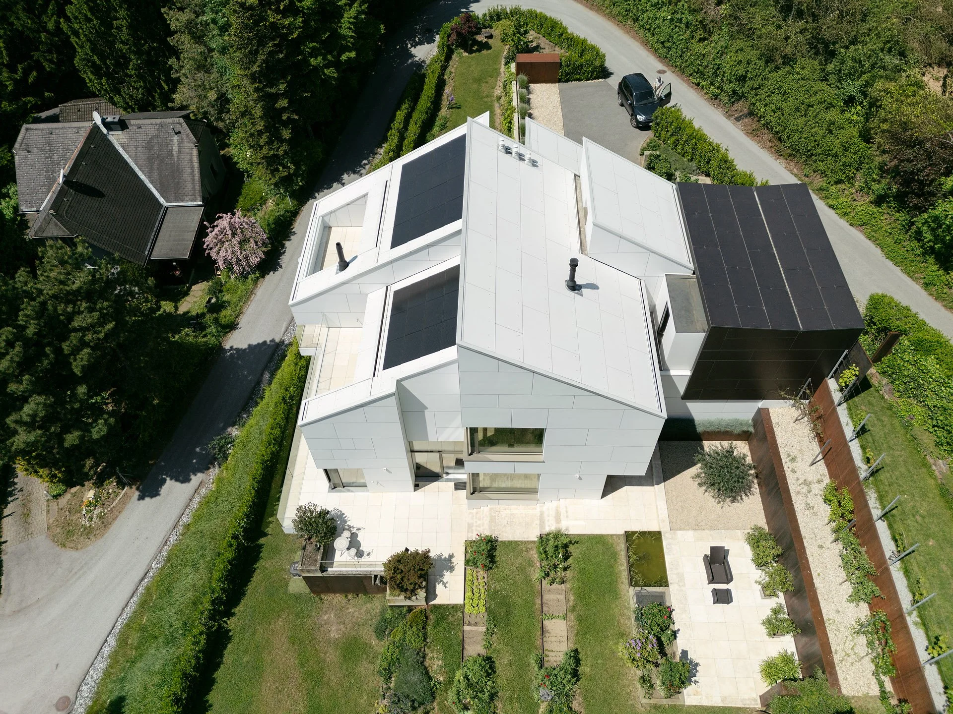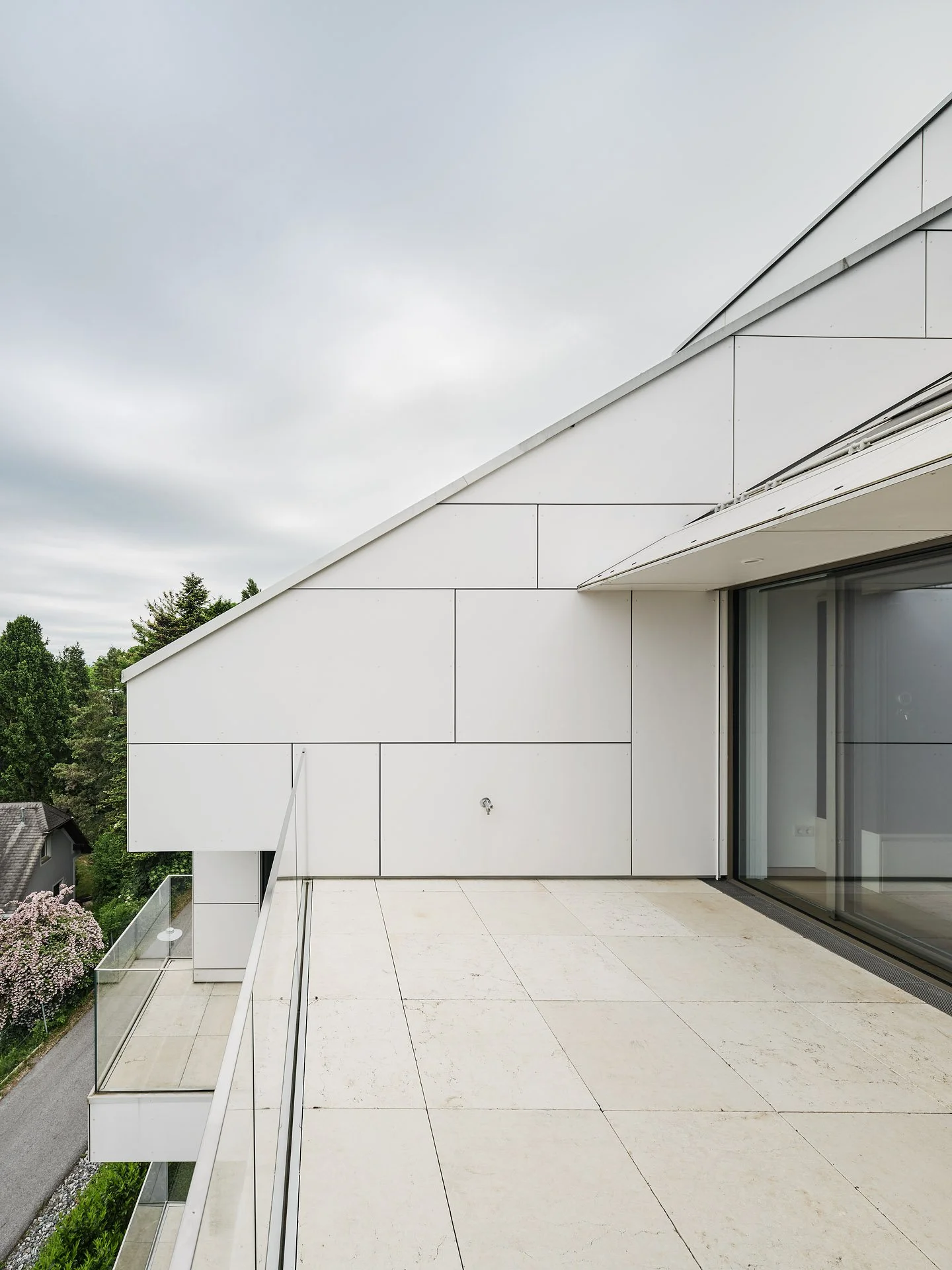 Das bestehende Wohnhaus aus den 70er Jahren wurde innen komplett neu organisiert und in zwei unabhängige Wohneinheiten geteilt, in seiner markanten Form jedoch erhalten. Durch die klare Linienführung und einheitliche Oberflächengestaltung von Dach und Fassade entstand ein völlig neues Erscheinungsbild – ein weißer Monolith.