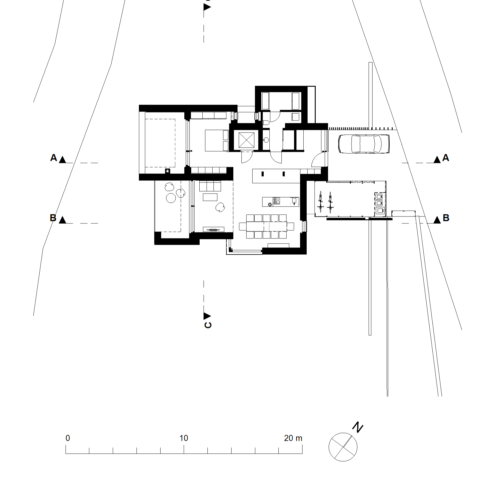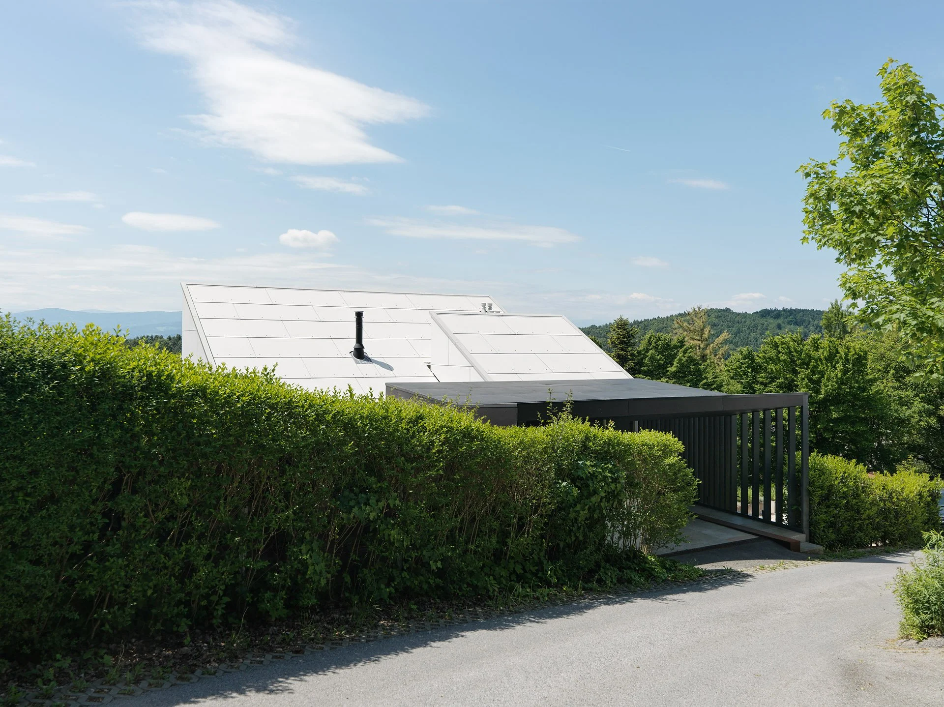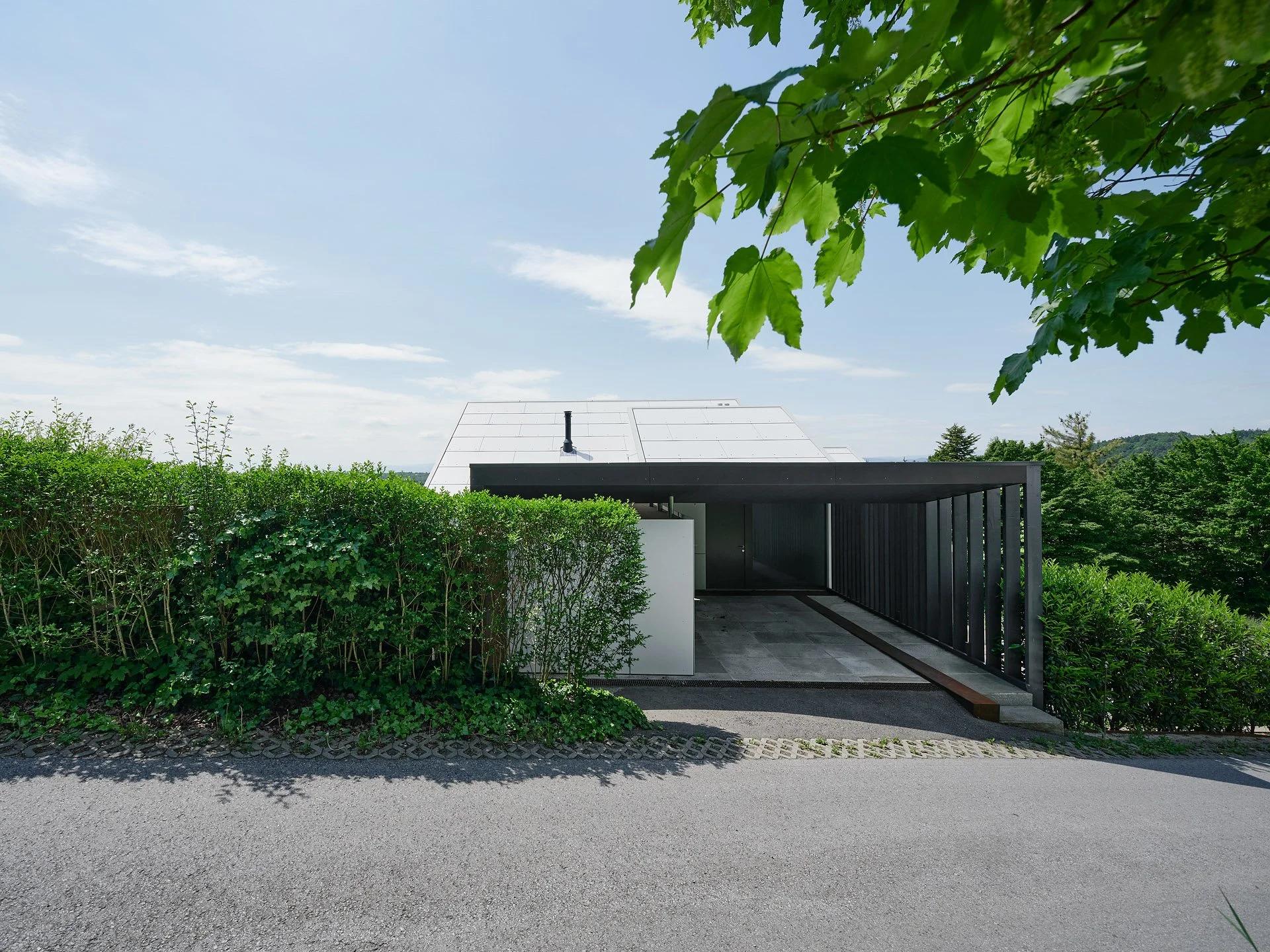 Das neue Carport setzt als schwarze Holzkonstruktion einen kräfigen Kontrapunkt zum hellen Wohngebäude.
