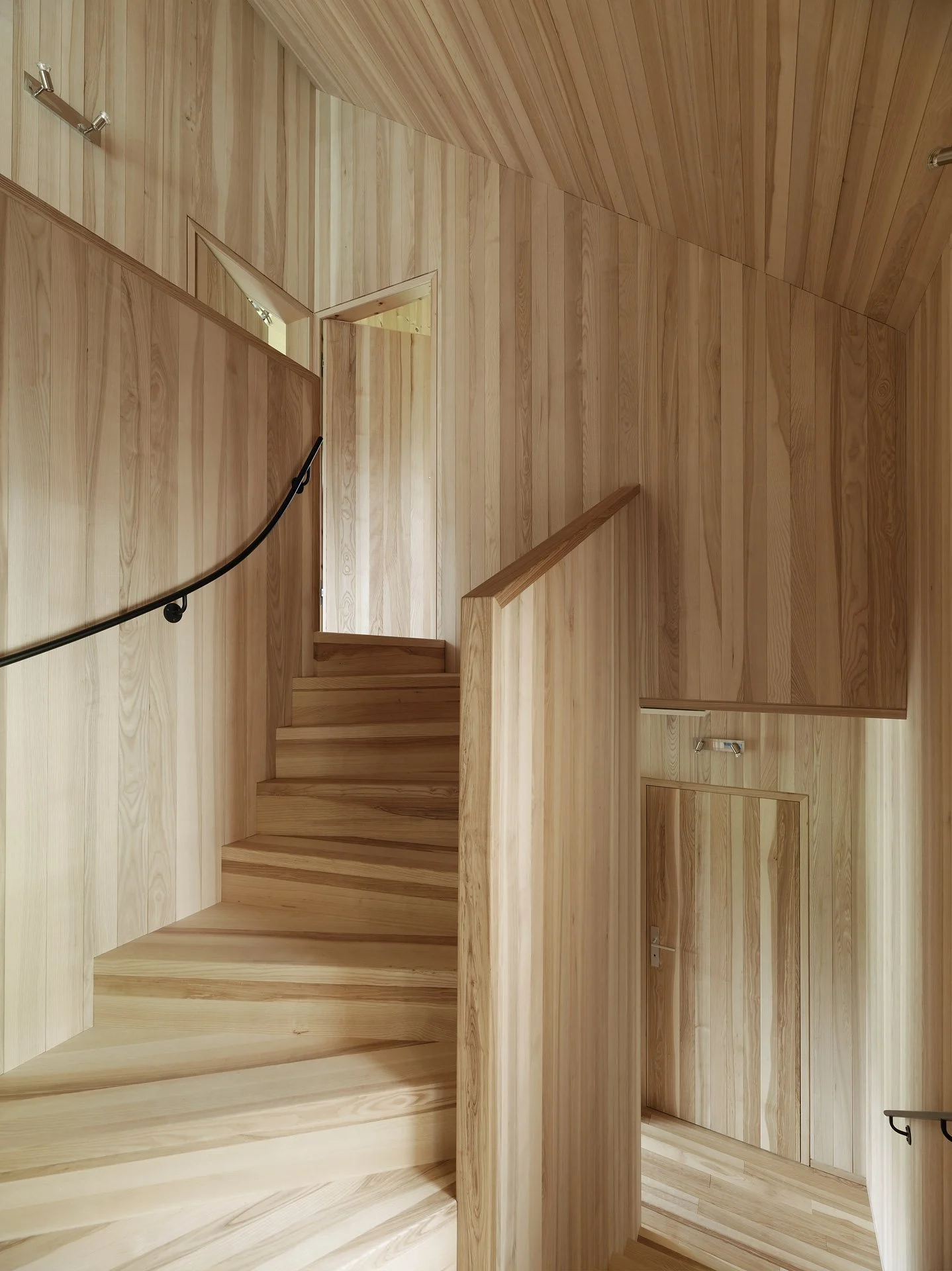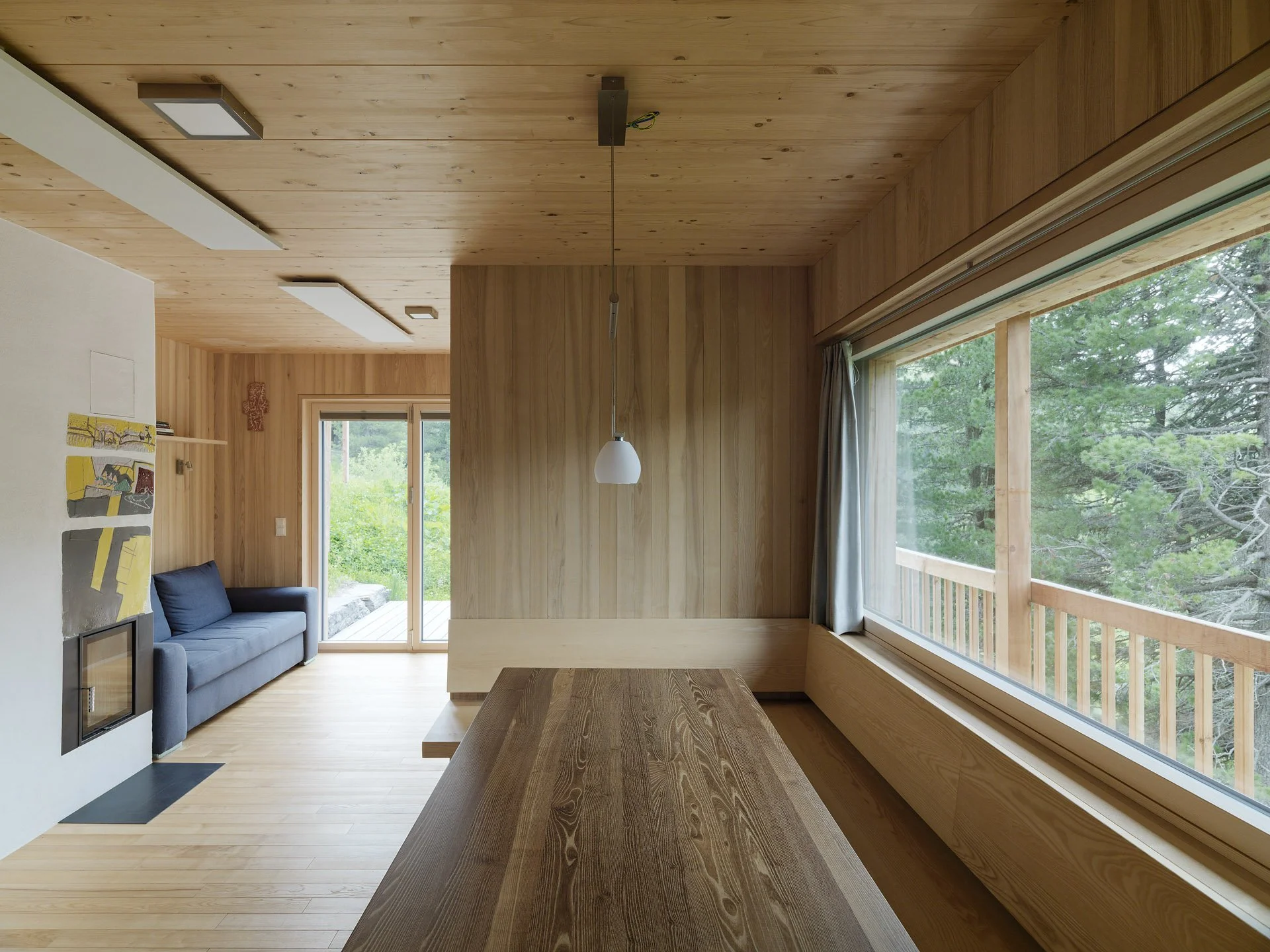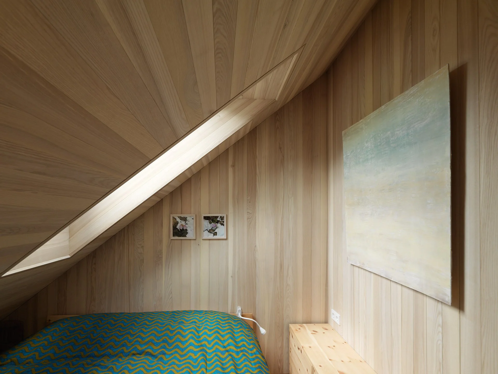 Die eigentliche Besonderheit zeigt sich erst im Innenraum: Boden, Wand, Türen und Decke sind mit hoher handwerklicher Sorgfalt mit unbehandeltem sägerauem Eschenholz getäfelt, und schaffen ein unmittelbares Wohlfühlklima mit besonderem Wert.
