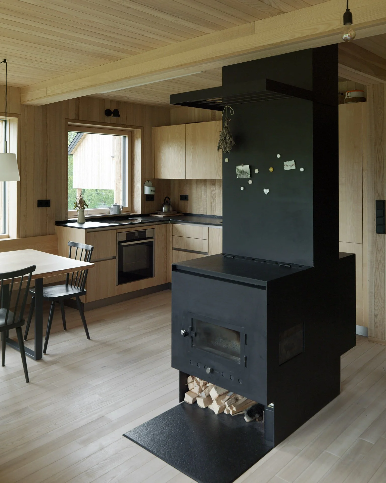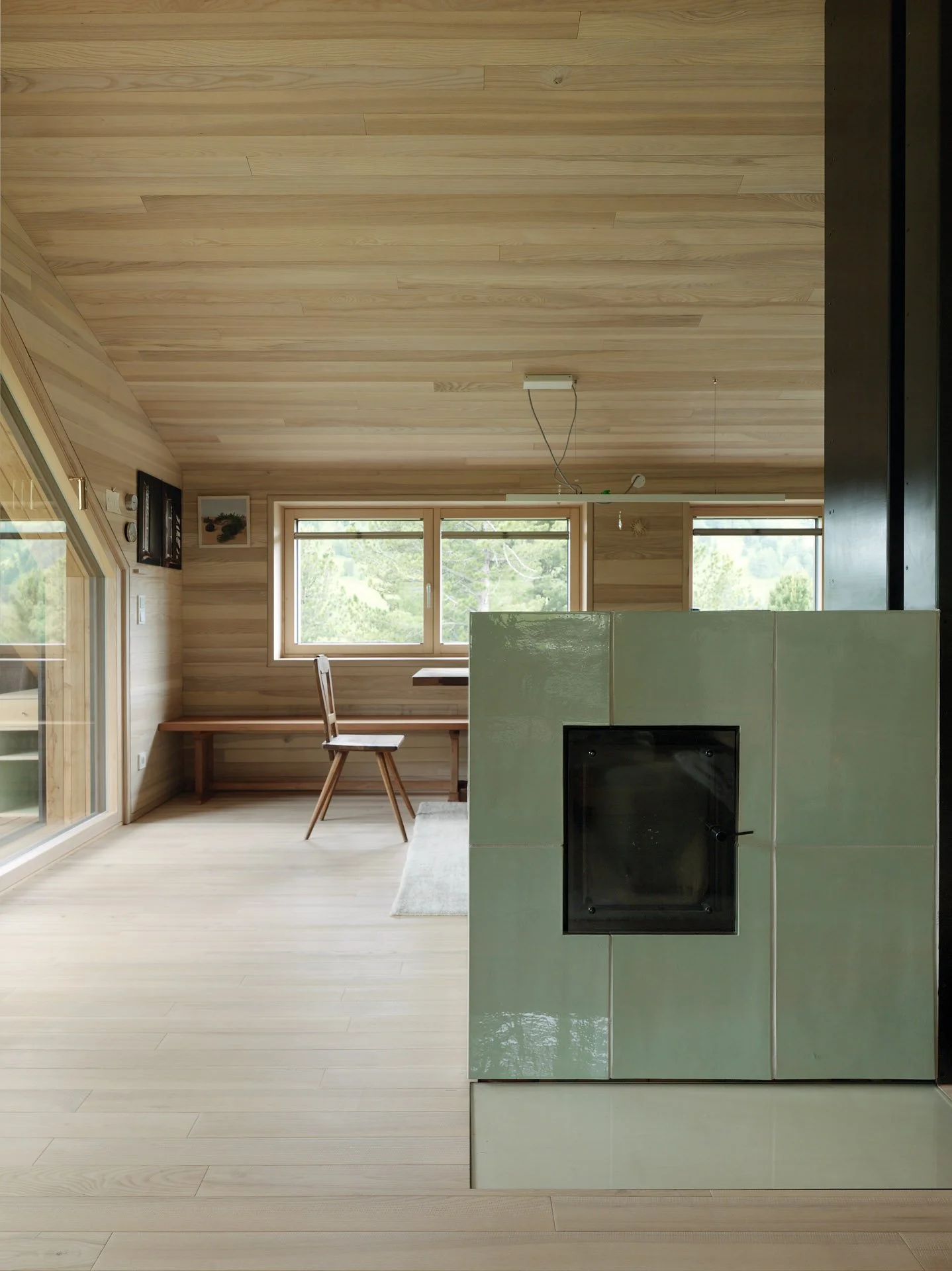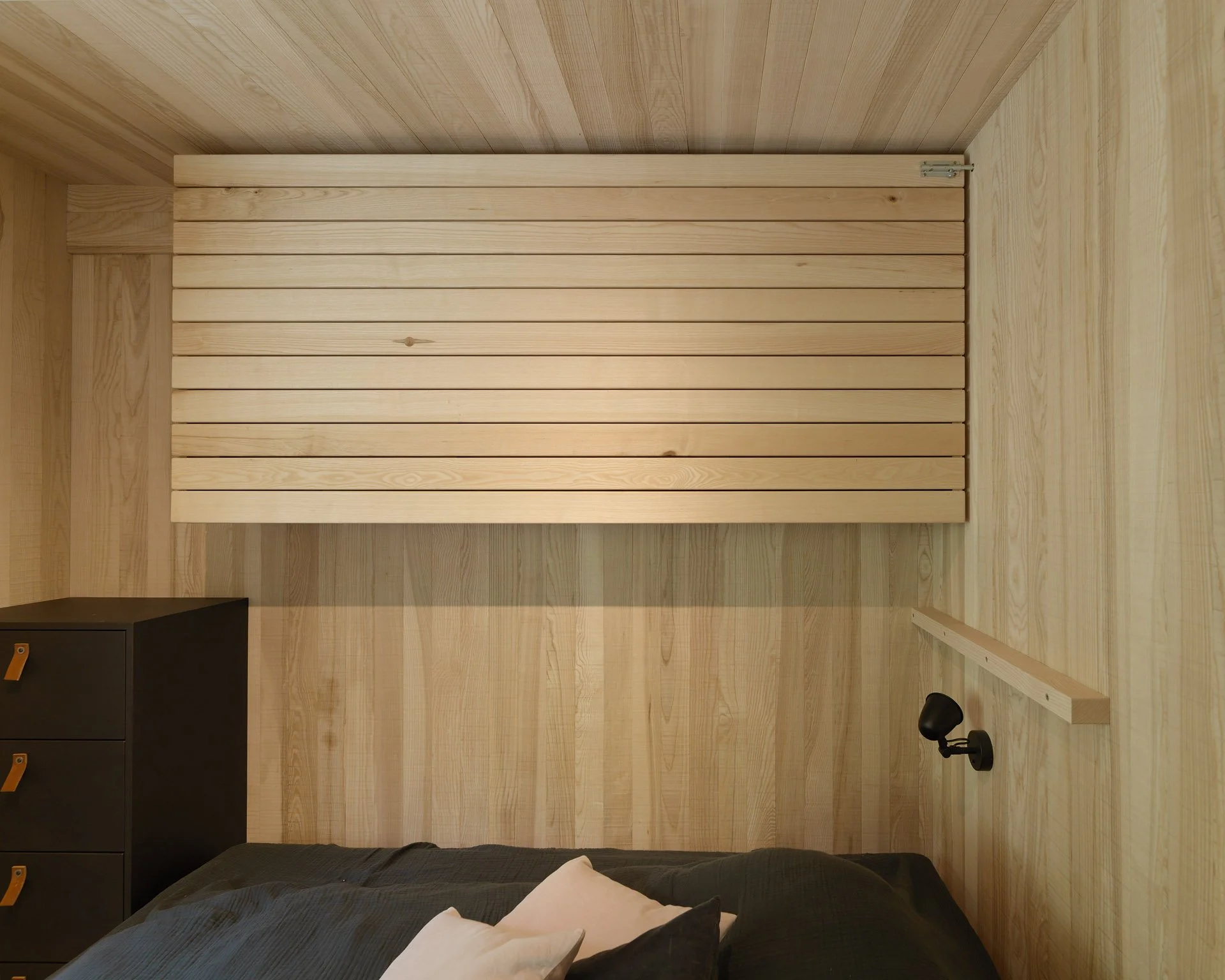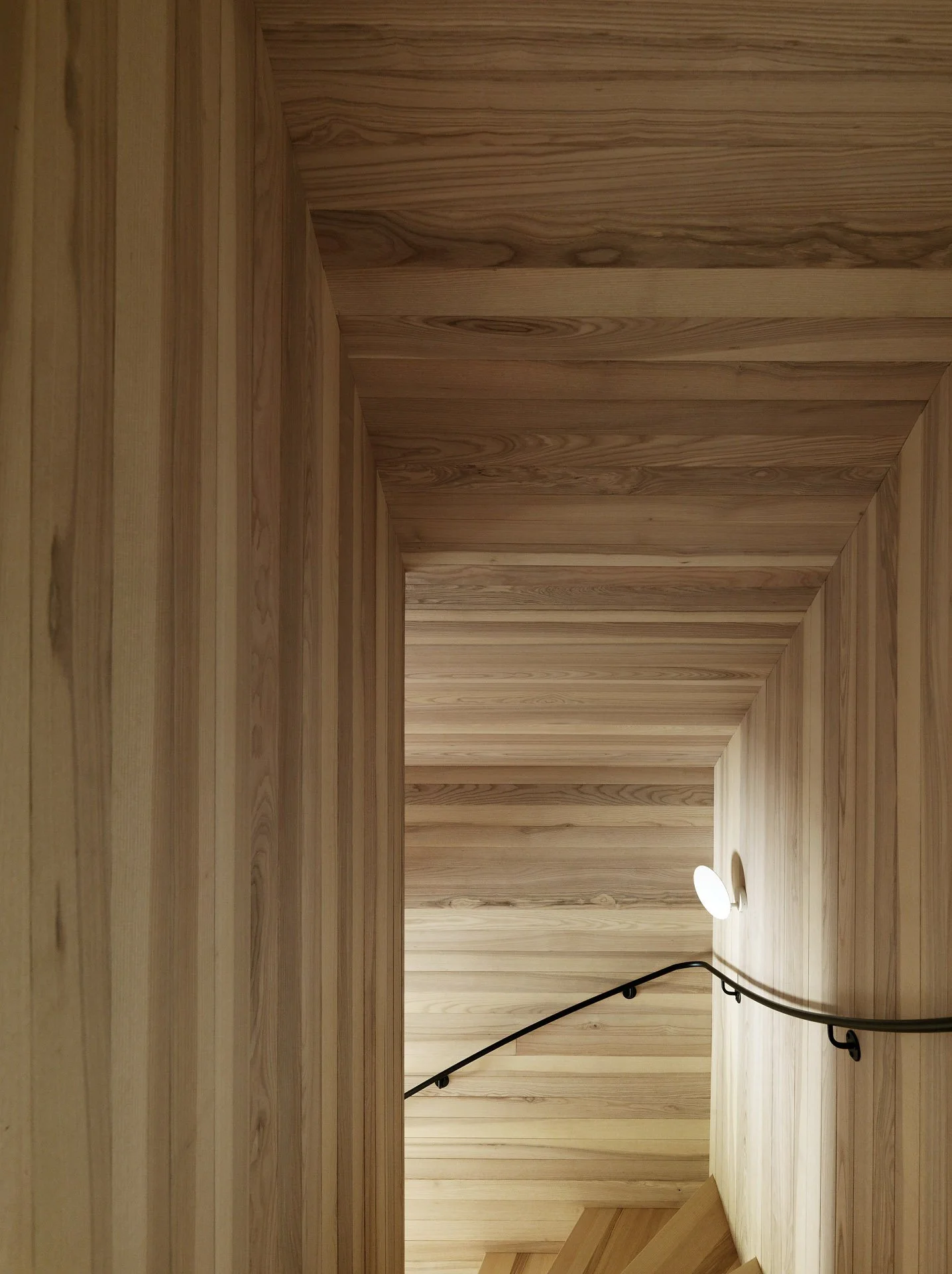 Die eigentliche Besonderheit zeigt sich erst im Innenraum: Boden, Wand, Türen und Decke sind mit hoher handwerklicher Sorgfalt mit unbehandeltem sägerauem Eschenholz getäfelt, und schaffen ein unmittelbares Wohlfühlklima mit besonderem Wert.