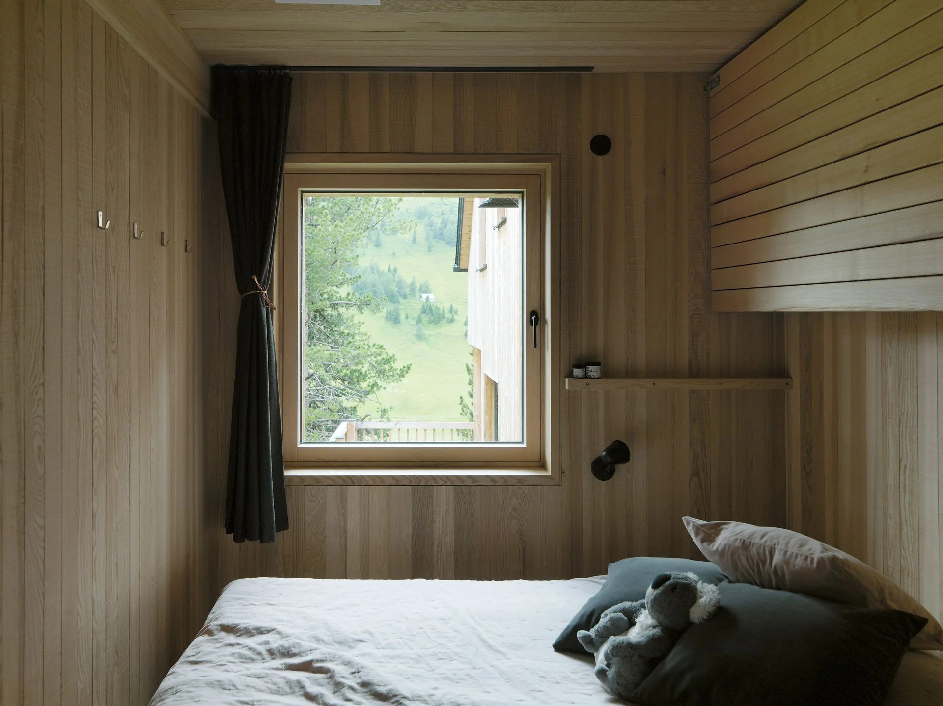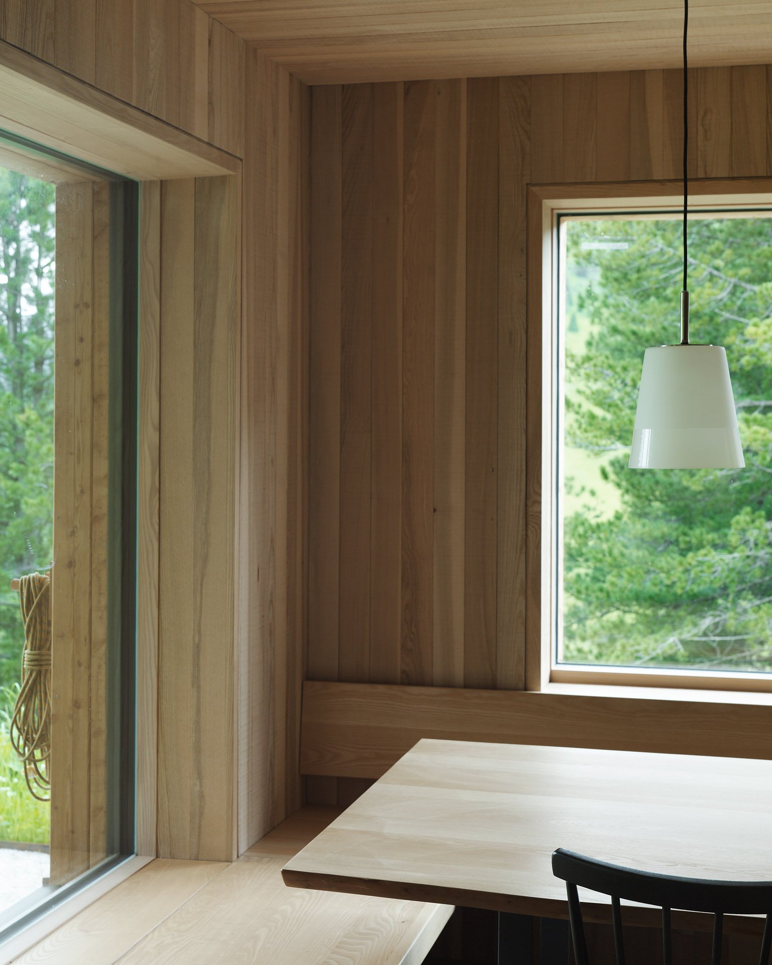 Die Details der Türstöcke und Fensterleibungen sind liebevoll ausgedacht und umgesetzt, ein wertschätzender Umgang mit dem Baustoff Holz zieht sich von der Planung bis zur handwerklichen Ausführung durch.
