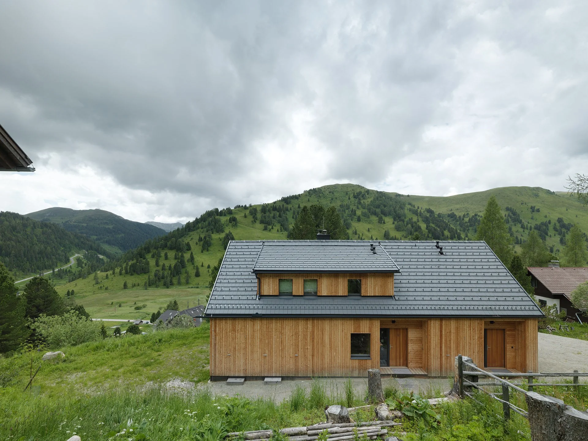 Der bestehende Blockbau und das Dach wurden thermisch sehr hochwertig mit Zellulose gedämmt - ein Bauteilaufbau mit sehr guter Ökobilanz. Unbehandelte vertikale Lärchen-bretter bekleiden die Außenhülle, das Dach ist mit grauen glatten Tonziegeln gedeckt.