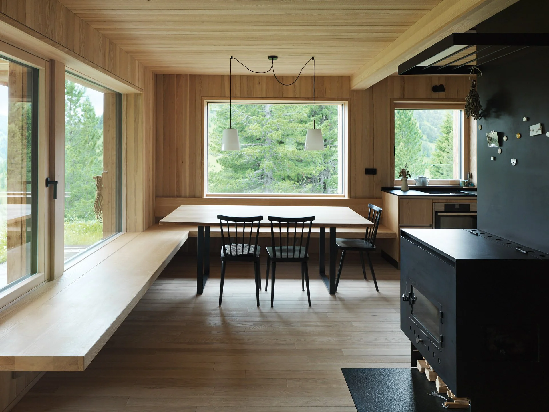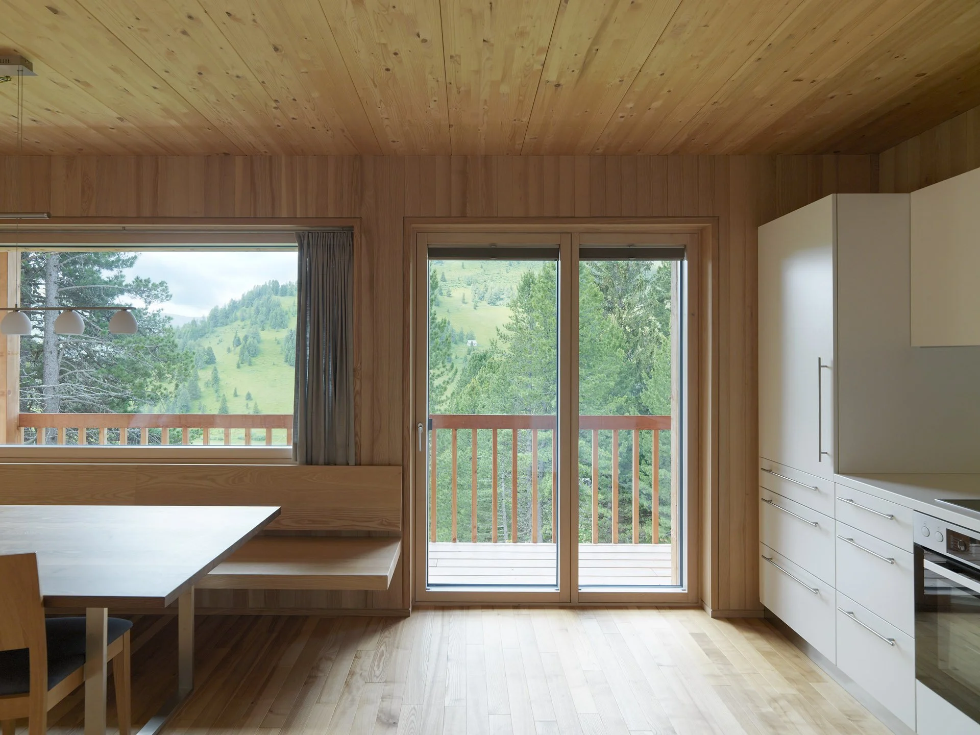 Großzügige, gezielt gesetzte Öffnungen füllen die Räume mit natürlichem Licht und geben beindruckende Ausblicke auf die umgebende Bergwelt frei. Die Holz-Alufenster in Passivhausqualität bieten dabei optimalen Komfort und höchste Energieeffizienz.
